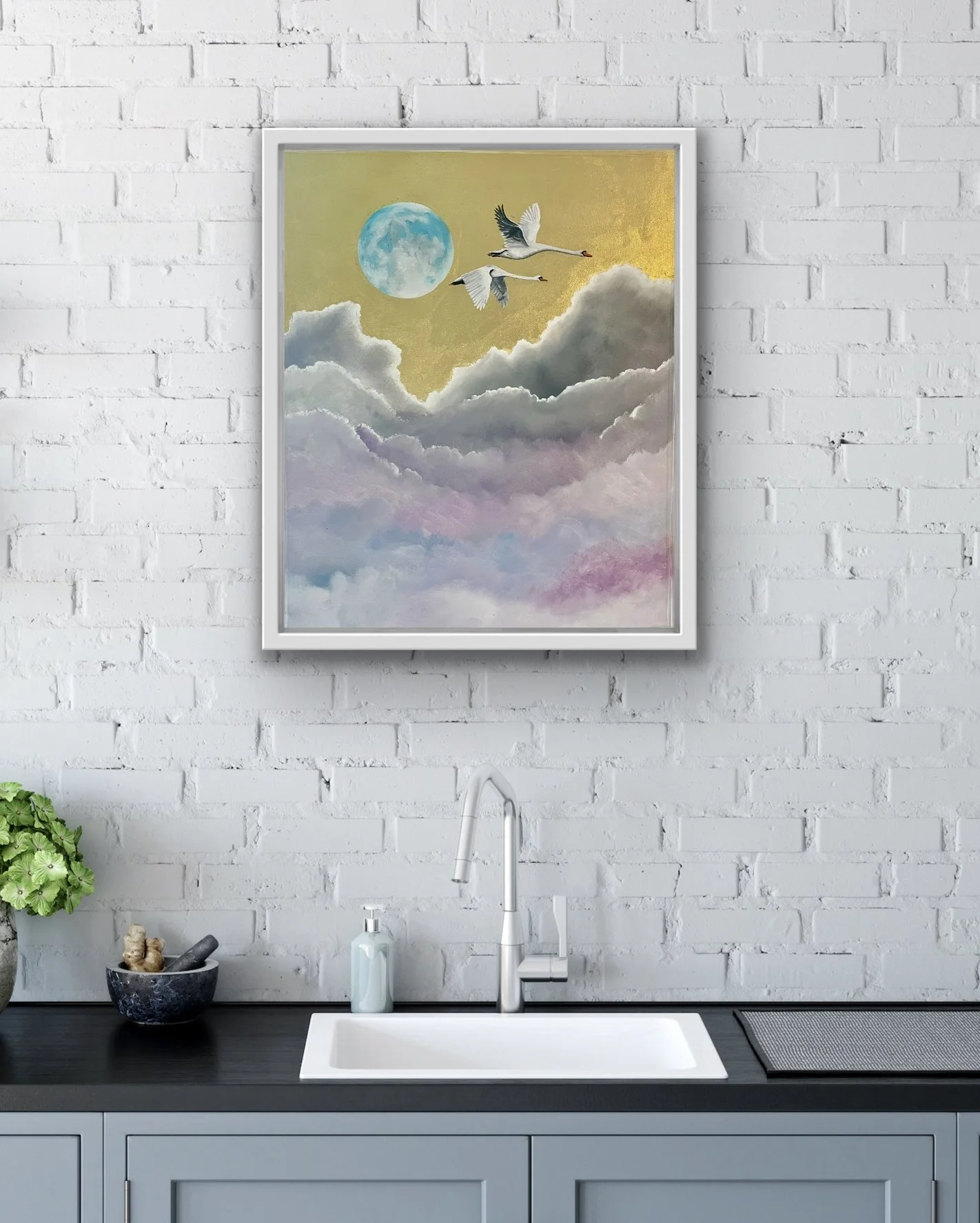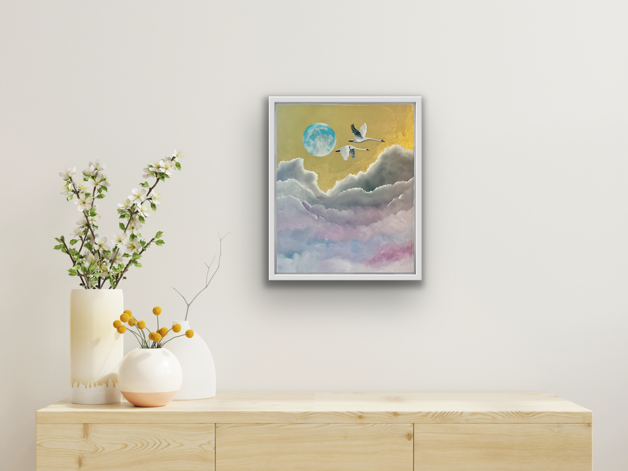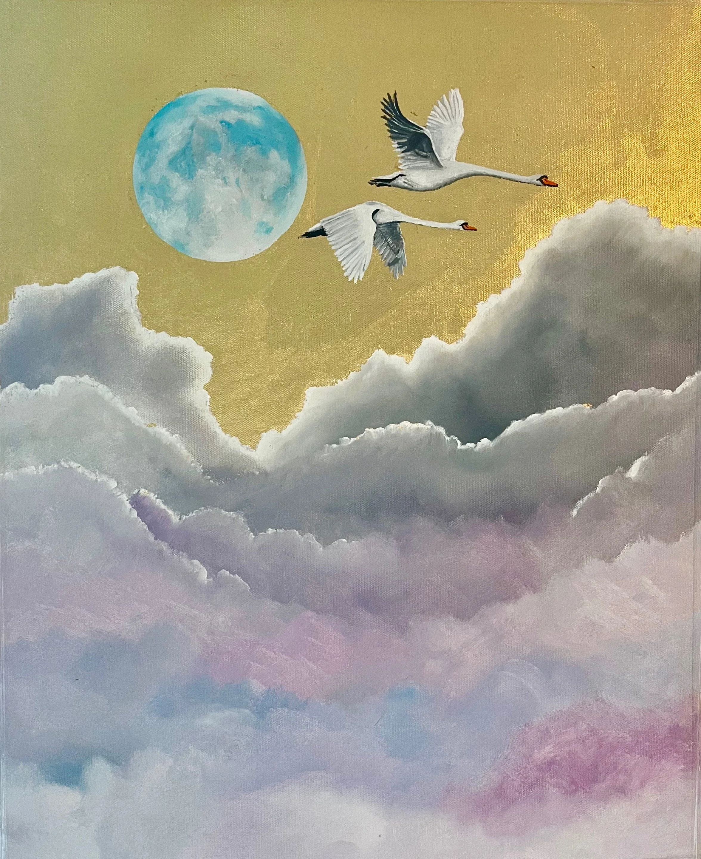 Fuchsia grows wild and abundantly in the summer in the West of Ireland where I live. My whole life I have associated them with summer days and dance because of their shape, I’ve always seen them as ballerinas. This painting sets them against silver leaf, which echoes the moon with such grace, highlighting the beauty of nature and the joy of a summer’s evening .